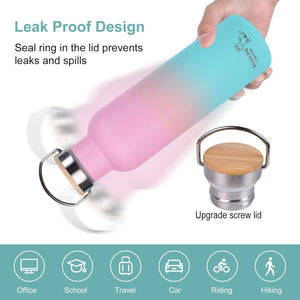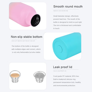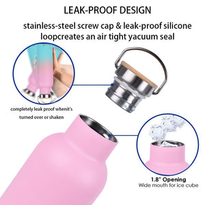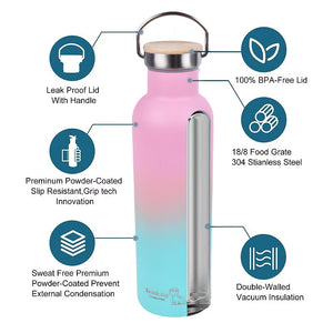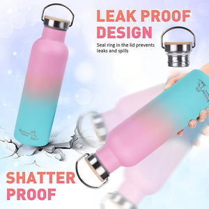 Designed for school, office, gym, travel, or outdoor use adventures, this bottle blends durability, style, and performance in one. Crafted from premium 18/8 food-grade stainless steel with double-wall vacuum insulation, it keeps drinks icy cold for up to 18 hours or warm and comforting for up to 12 hours. The leak-proof screw lid features a built-in silicone seal, preventing spills, while its wide-mouth opening accommodates standard ice cubes and makes cleaning effortless. With a smooth, rounded rim for comfortable sipping, a non-slip stable bottom, and a sweat-proof gradient powder-coated finish, this bottle is stylish, safe, and reliable for kids, teens, and adults alike.